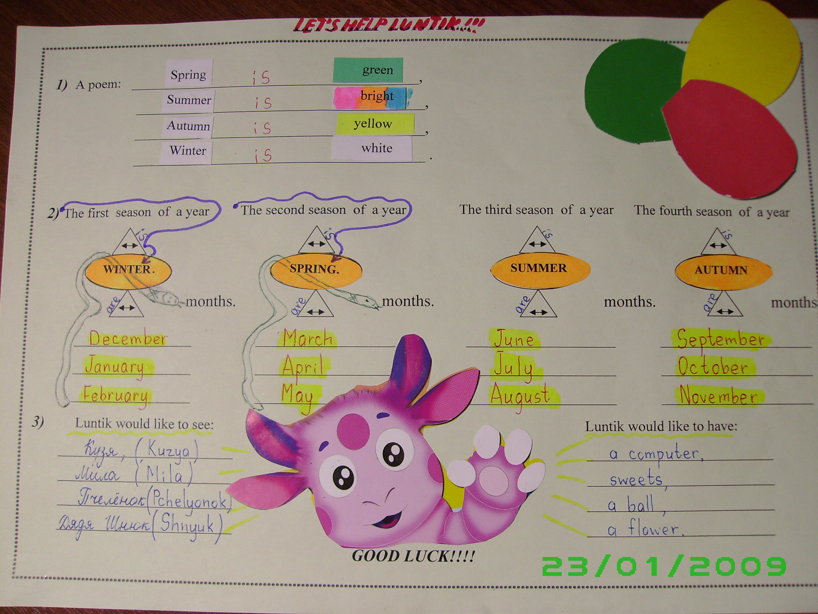 -Luntik has got some questions to you: what season is the first?(the second,и т.д.) (Дети находят на заготовке нужный лепесток и приклеивают его на свои рабочие листы. Один работает у доски с карточками/название сезонов/ и картинками сезонов, располагает картинки по очереди приклеивает к ним соответствующее название). Проверка работ.