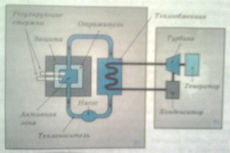 Активная зона реактора посредством труб соединяется с теплообменником, образуя так называемый первый замкнутый контур. Насосы обеспечивают циркуляцию воды в этом контуре. При этом вода, нагретая в активной зоне, нагревает воду в змеевике второго контура, превращая ее в пар. Таким образом, вода в активной зоне реактора служит не только для замедления нейтронов, но и теплоносителем. Энергия пара, образовавшегося в змеевике, преобразуется в электроэнергию. Посредством этого пара вращается турбина, которая, в свою очередь, приводит во вращение ротор генератора электрического т ока. Выработанный пар поступает в конденсатор и превращается в воду. Затем весь цикл повторяется.