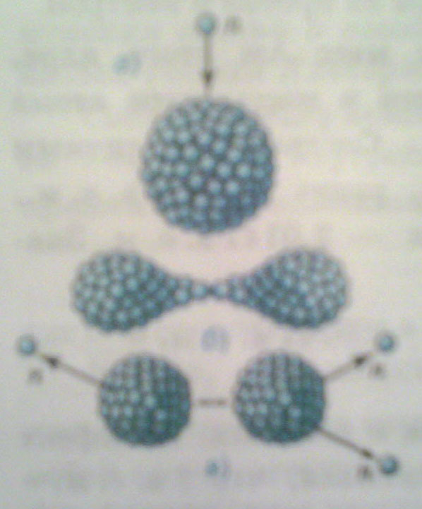 Образующиеся в процессе этой реакции нейтроны и сколки ядер, разлетаясь с большой скоростью, попадают в воду, сталкиваются с ядрами атомов кислорода и водорода, отдают им часть своей кинетической энергии и замедляются. Вода при этом нагревается, а замедленные нейтроны через какое-то время опять попадают в урановые стержни и участвуют в делении ядер.