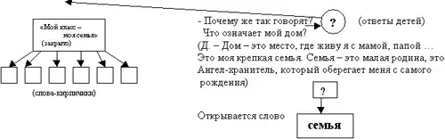 Оборудование: на доске слева: "Когда все вместе…", в середине доски: "Дом - крепость" из слов в виде кирпичиков (закрыты). В центре "Дома" - закрыты слова "Мой класс - моя семья".