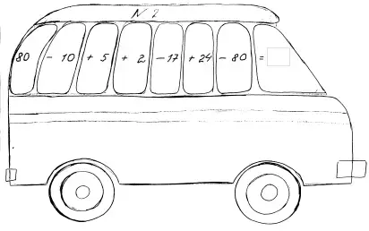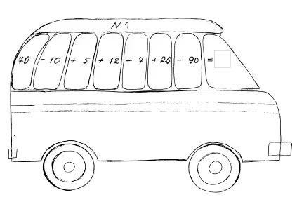 - А теперь от вас зависит, как быстро мы приедем к следующему заданию. (На двух листочках нарисованы автобусы, а в окнах этих автобусов написаны примеры, их нужно решить).