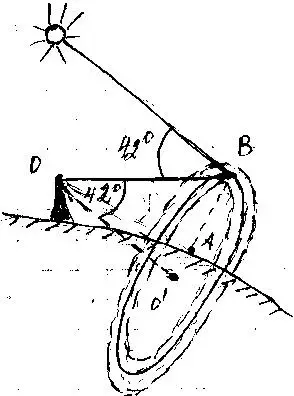 лучей в атмосфере приводит к тому, что наблюдатель видит солнечный диск под углом, образуемом на рисунке штриховыми прямыми, т.е. видит диск, слегка приплюснутый в вертикальном направлении.