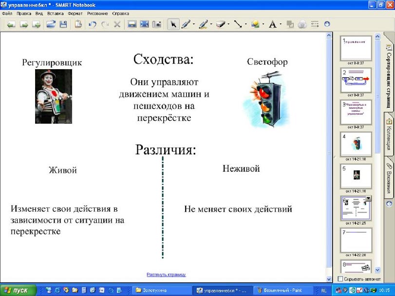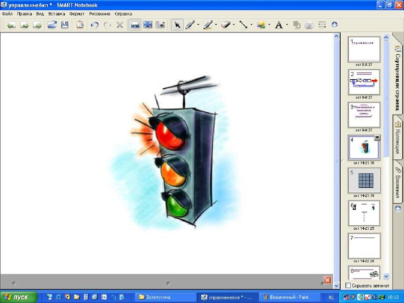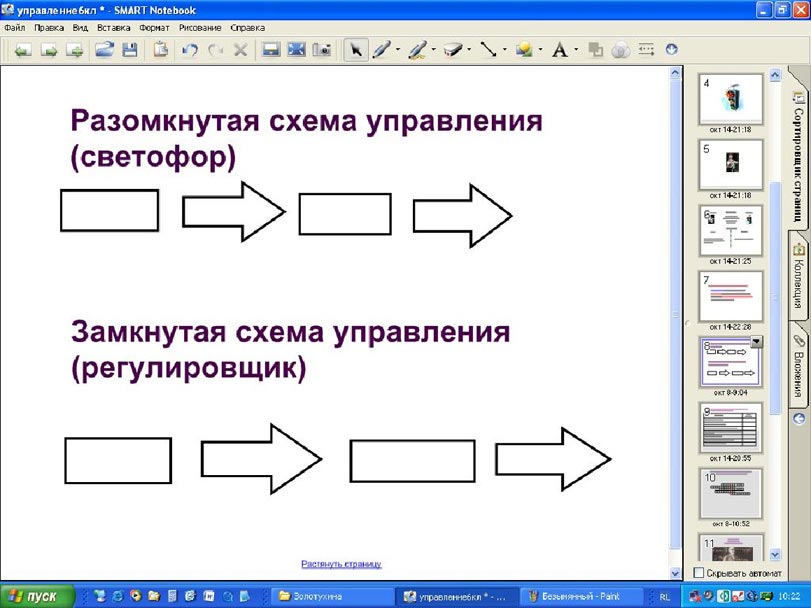 Страница 8 <Рисунок 10>. Составьте теперь схемы управления для светофора и регулировщика. В чем их отличие? (У регулировщика есть обратная связь). Схемы формируются учащимися на интерактивной доске, в протоколах работы группы, зарисовываются в тетрадях.