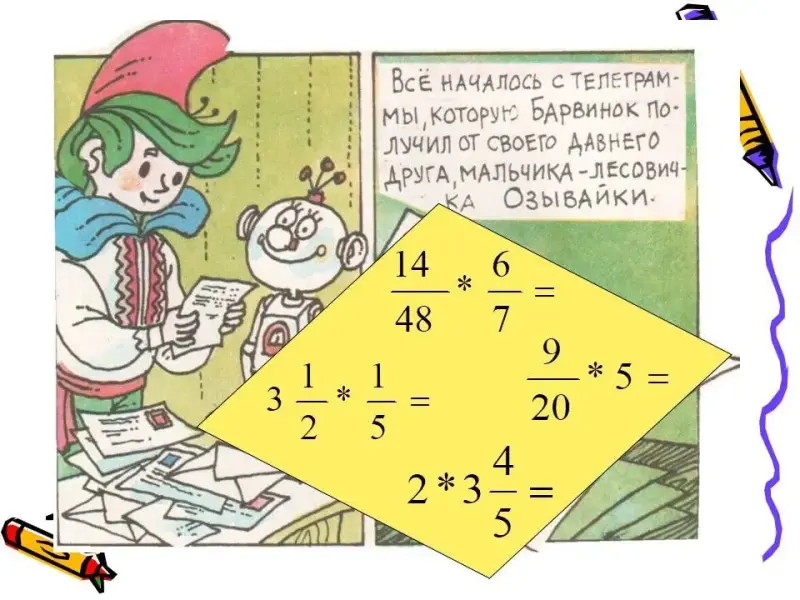Учитель: Все началось с телеграммы, которую Барвинок получил от своего друга, мальчика-лесовичка Озывайки. Она здесь, но прочитать её мы сможем, когда примеры решим.