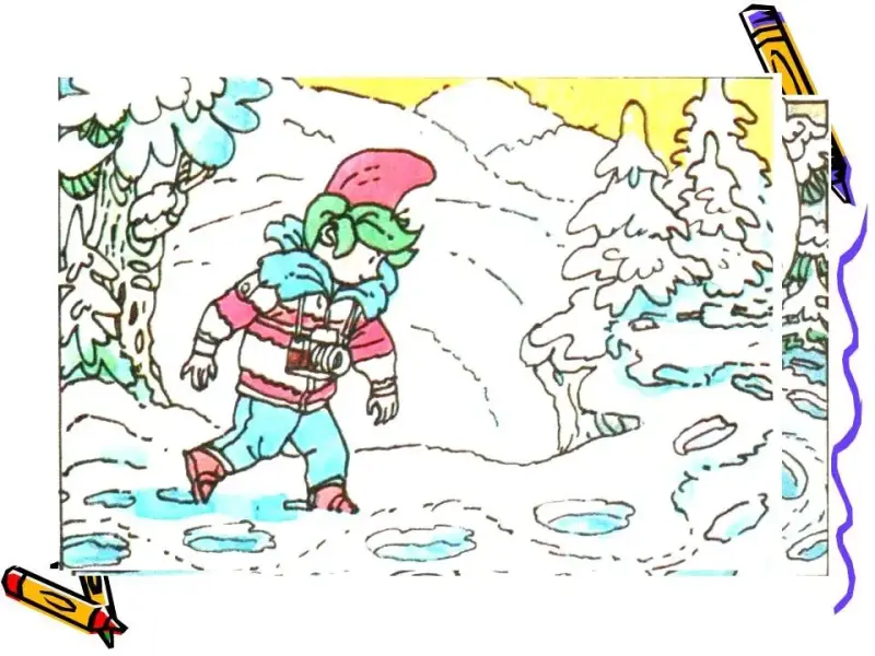 Учитель: Вскоре сказочный вертолет уже подлетал к владениям Озывайки. В снегу виднелись странные следы. Приземлились. Не успел Барвинок сделать несколько шагов, как почувствовал, как летит куда-то. Через мгновение он исчез под снегом.
