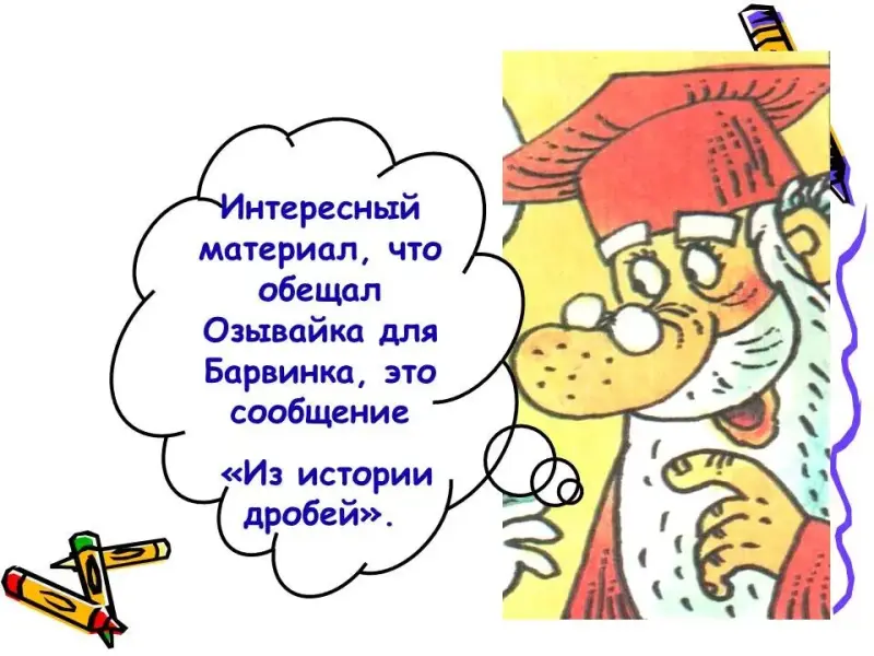 Интересный материал, что обещал Озывайка Барвинку, расскажет нам :(ученик с сообщением). "Из истории дробей".