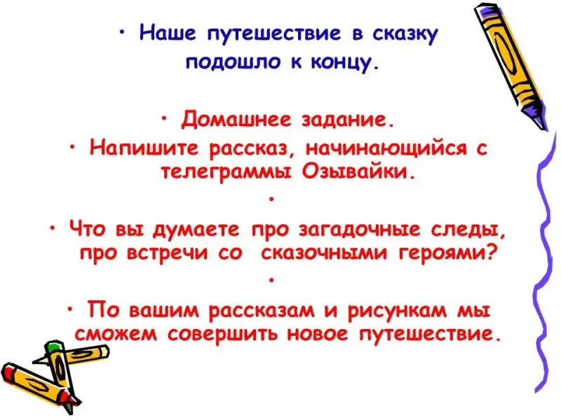 Предлагаю вам написать рассказ, начинающийся с телеграммы Озывайки. Что вы думаете про загадочные следы, про встречи со сказочными героями. По вашим рассказам и рисункам мы сможем совершить новое путешествие.
