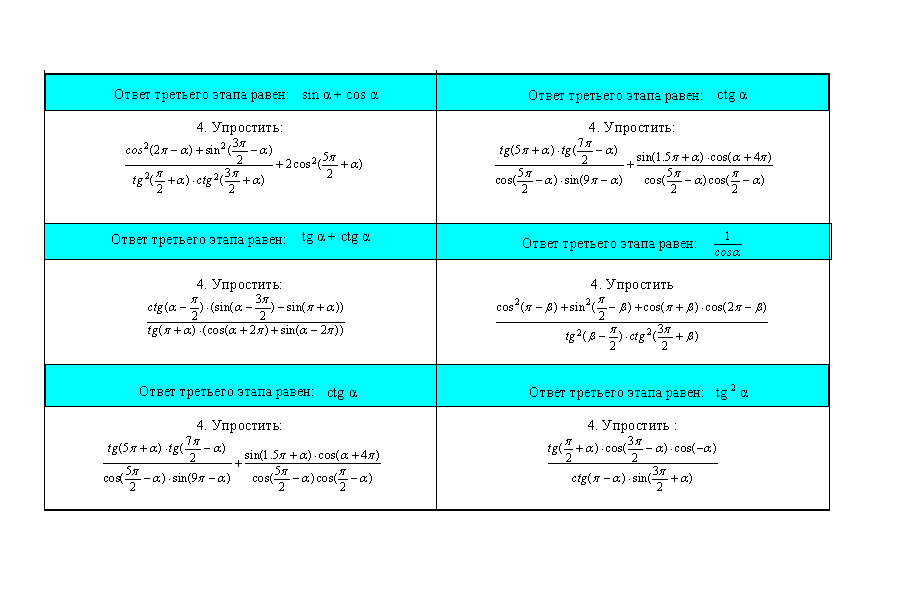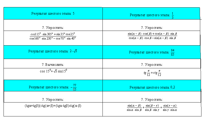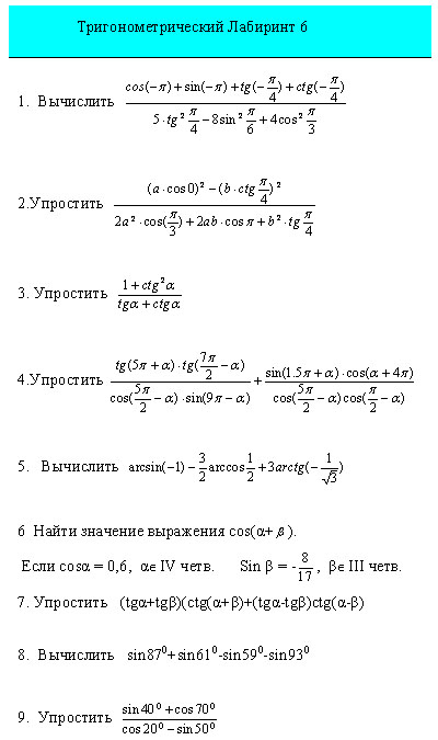 В течение одного урока командам предстоит решить по десять заданий на преобразования тригонометрических выражений. Выигравшей становится та команда, которая быстрее всех справится со всеми заданиями и не запутается в лабиринте.