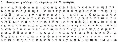 - Приготовьте синий и жёлтый карандаш, возьмите карточку с заданием 1. В задании подряд записаны буквы. Вы считаете буквы подряд: первая, вторая, третья; первая, вторая, третья и так далее. В течение первой минуты вы должны синим карандашом подчёркивать первую букву и вычёркивать третью. Работу надо начинать по сигналу: «Внимание, начали!» Как только я скажу: «Стоп. Вторая минута!», вы возьмёте жёлтый карандаш и в течение второй минуты, наоборот, будете вычёркивать каждую третью. Как только я скажу: «Стоп. Закончили», вы положите карандаш.
