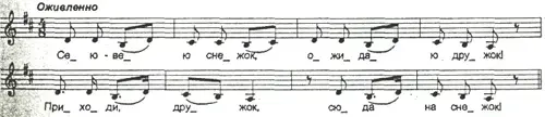 Хозяйка: А я вот вам расскажу, как в старину гадали. Девушки выходили на улицу, и, набрав в сборчатые подолы своих шубок снег, рассеивали его по сторонам, и, кружась, пели: