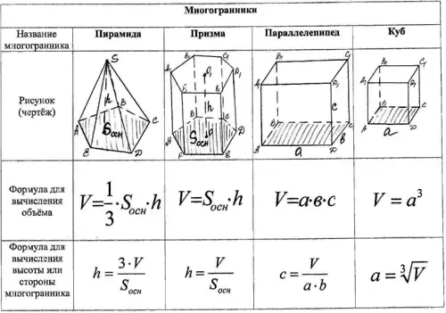 | Формула для вычисления высоты или стороны многогранника |
