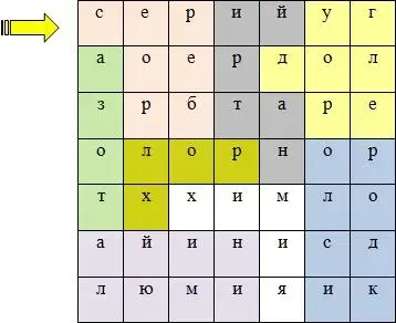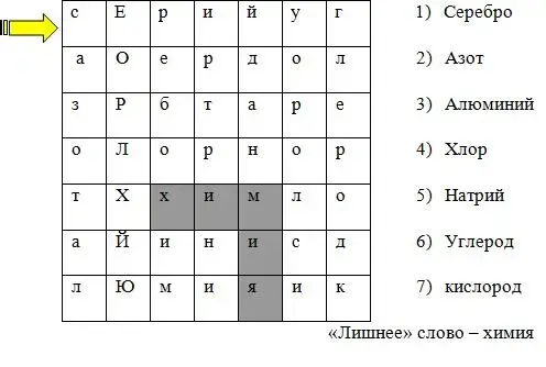 Первое задание: На столах у каждой команды находятся карточки с кроссвордами на тему "Химические элементы". Начиная путь по стрелке, поворачивая только на 90о, необходимо определить все зашифрованные русские названия химических элементов и найти лишнее слово.