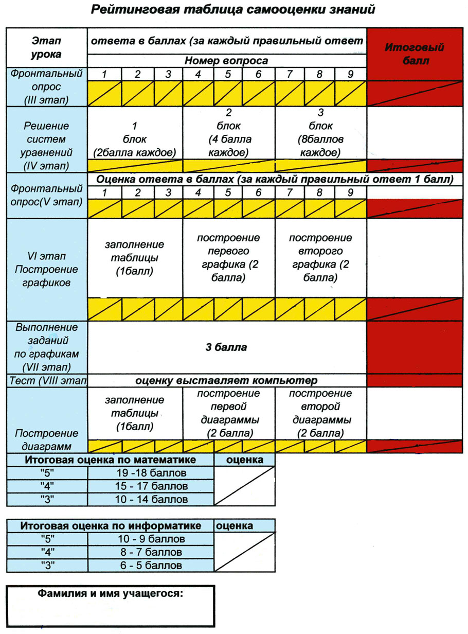 У: Ребята, для того, чтобы вы смогли оценить свою работу на уроке, вы должны построить диаграмму в POWER POINT и сравнить заработанные баллы на каждом этапе урока с максимально возможными. Соответствие баллов заработанным оценкам находится в ваших рейтинговых оценках.