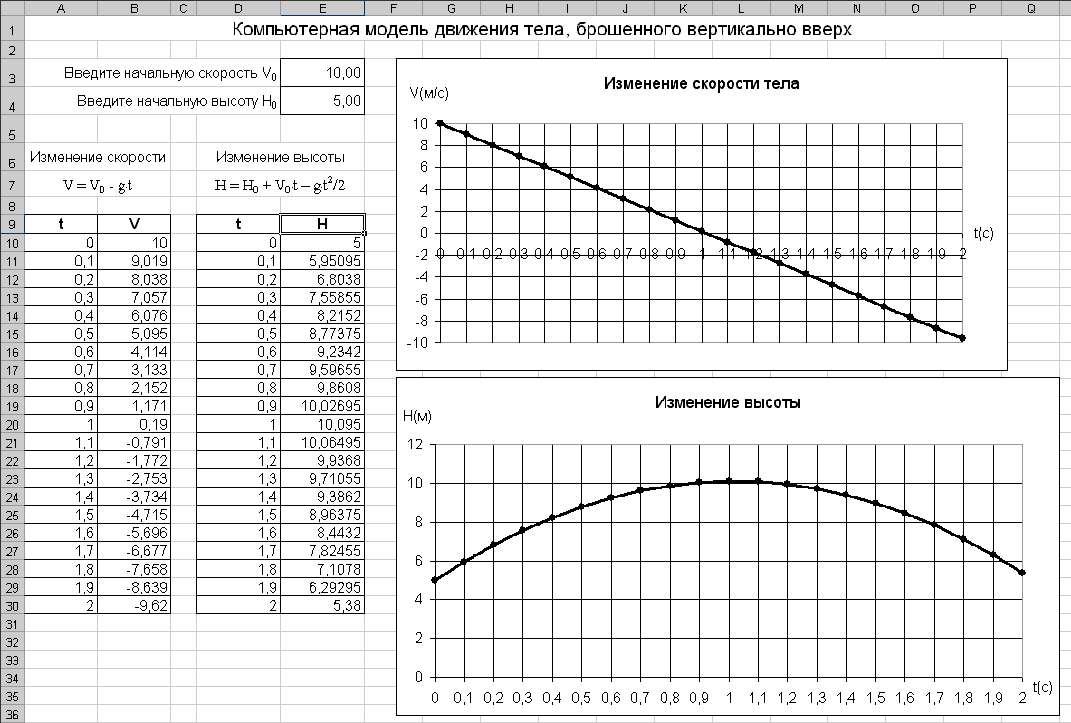 копируем эту формулу в ячейки E11:E30 с помощью автозаполнения. - по группе ячеек B10:B30 строим график «Изменение скорости тела», по группе ячеек Е10:Е30 строим график «Изменение высоты».