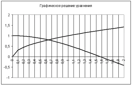 Для графического решения построим графики каждой из функций на отрезке [0, 2] с шагом (изменением х) 0.1. Чтобы построить графики функций для каждой функции построим таблицу значений, используя стандартные функции COS и КОРЕНЬ.