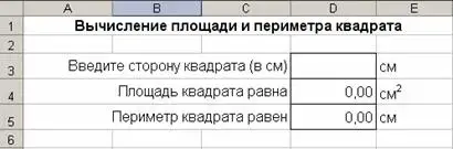 В ячейку D3 введем значение стороны квадрата, в ячейках D4 и D5 получим соответственно значения площади и периметра. Результаты запишем в тетрадь.