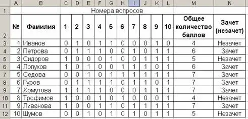 - в ячейку N3 ввести формулу =ЕСЛИ(M3>=6;"Зачет";"Незачет")