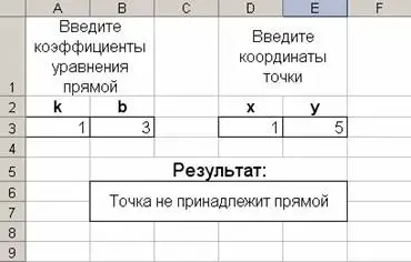 =ЕСЛИ($A$3*$D$3+$B$3=$E$3;"Точка принадлежит прямой";"Точка не принадлежит прямой")