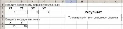 =ЕСЛИ(И($A$7>=$A$3;$A$7<=$C$3;$B$7>=$B$3;$B$7<=$D$3);"Точка лежит внутри прямоугольника";"Точка не лежит внутри прямоугольника")