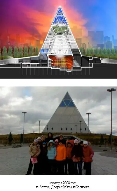 1 ученик: Дворец мира и согласия - уникальная пирамида, возведенная на века выдающимся британским архитектором Норманном Фостером в 2006 году. В церемонии его открытия принимали участие президенты Кыргызстана, Узбекистана и Таджикистана, прибывшие в Астану для участия в неформальном саммите глав государств Центральной Азии. Дворец символизирует собой единение различных религий, этносов и культур.