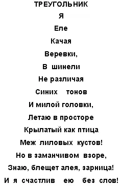 - Великие поэты тоже не оставались в стороне от жителей страны Геометрии. Посмотрите, какие поэтические опыты проводили Валерий Брюсов и Гавриил Романович Державин (показать стихи, записанные в в форме треугольника и пирамиды)