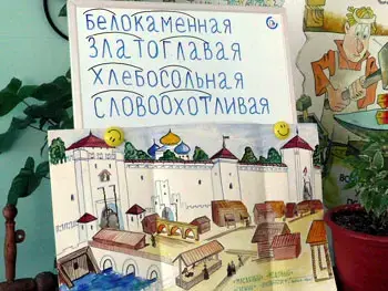 Оборудование: окна избы, изображение печки, деревянные ложки, солонка, чугунок, половики, лавки, скатерть, рушники, самовар, блюдо с пирожками, рогожка (грубая ткань), кузовок, ремешок, кукла, гребень деревянный, домовёнок, петушок, слайды (10), изображение старой Москвы, слова-опоры: жанры фольклора, устное народное творчество, загадки, пословицы, поговорки, скороговорки, потешки.