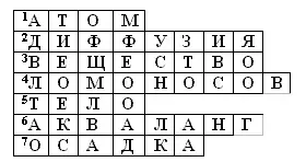 Ассистенты раздают карточки с уже разгаданными кроссвордами. Однако нумерация слов в этом кроссворде не совпадает с нумерацией вопросов. Участникам конкурса надо установить соответствия между номерами и опросами.