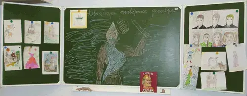 Затем все работы выводятся на экран с помощью проектора. Команды представляют работы, сопровождая чтением строк из поэмы.