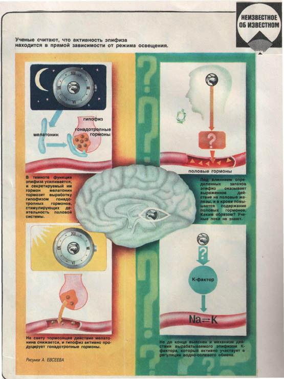 Ученик. Эпифиз был известен уже 2 тыс. лет назад, но до сих пор эта железа размером с горошину и весом 0,5 г. запрятанная в самую глубину головного мозга и сверху прикрытая большими полушариями, остается загадкой. Индийские и тибетские философы считают его органом ясновидения. Шишковидная железа активна в течение всей жизни. При различных заболеваниях она ведет себя по-разному. Гормон мелатонин способен влиять и на гипофиз. Биологически активные вещества, секретируемые эпифизом, способны тормозить выработку гипофизом гормона роста. Эпифиз участвует в регуляции водно-солевого обмена. Он продуцирует К-фактор, активно влияющий на обмен калия. Эта железа играет роль главных биологических часов организма. Она поддерживает контакты со щитовидной железой, может задерживать развитие тиреотоксикоза.