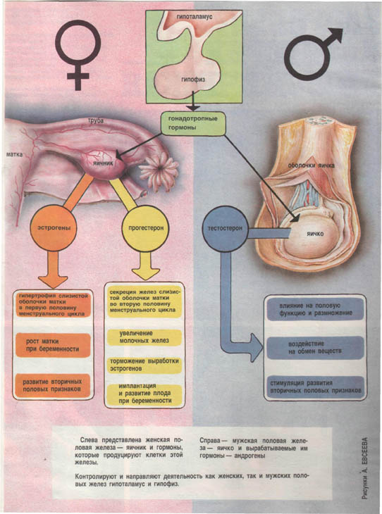 Учитель. Гонады, или половые железы, - единственные эндокринные железы, которые различны у мужчин и женщин. Направляют их деятельность и задают ритм их гормональной активности гипоталамус и гипофиз (рис. 9).