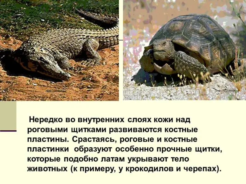 Дополнение учителя: Нередко во внутренних слоях кожи над роговыми щитками развиваются костные пластины. Срастаясь, роговые и костные пластинки образуют особенно прочные щитки, которые подобно латам укрывают тело животных (к примеру, у крокодилов и черепах).