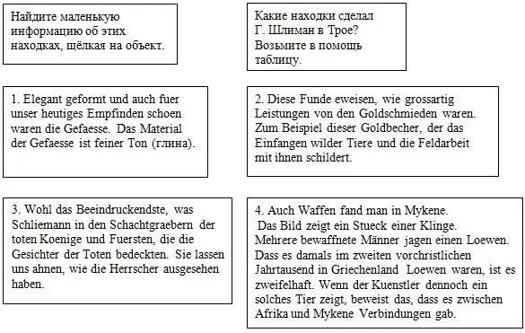 Obgleich mein Vater weder Philologe noch Archaeologe war, hatte er ein leidenschaftliches Interesse fuer die Geschichte des Altertums; oft erzaehlte er mir mit warmer Begeisterung von dem tragischen Untergange (гибели) von Pompeji… Oft auch erzaehlte er mir bewundernd ueber die Taten der homerischen Helden und die Ereignisse des Trojanischen Krieges, und stets fand er dann in mir einen eifrigen Verfechter (Verteidiger) der Sache Trojas. Mit Betruebnis (traurig) erfuhr ich von ihm, dass Troja so gaenzlich zerstoert worden war, dass es ohne eine Spur zu hinterlassen (бесследно) vom Erdboden verschwunden sei (якобы исчезла).