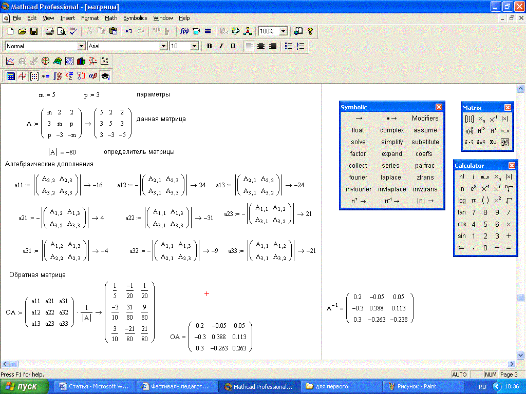 При вычислении матрицы, обратной данной удобно вывести на экран определитель матрицы и алгебраические дополнения элементов матрицы. Знак символьного вывода позволит вывести каждый элемент обратной матрицы в виде обыкновенной дроби, как это обычно получается при ручном способе решения. Специальный встроенный оператор для вычисления обратной матрицы позволит проверить полученные вычисления. Пример такого шаблона приведён на Рисунке 3.