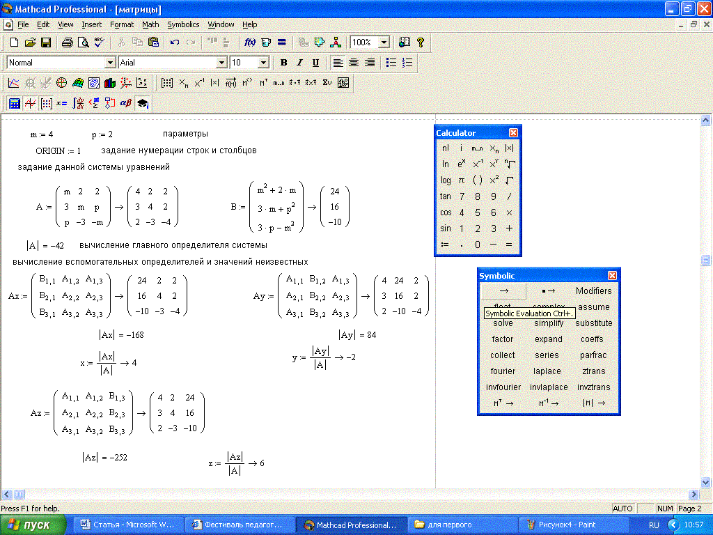 При вычислении определителя матрицы третьего порядка для удобства проверки удобно видеть на экране промежуточные результаты: все положительные и отрицательные слагаемые и их суммы. Для удобства вывода этой информации можно задать привычную нумерацию строк и столбцов с помощью системной переменной ORIGIN, присвоив ей значение, равное единице. Чтобы извлечь элемент матрицы, находящийся в позиции (i,k), необходимо ввести идентификатор матрицы с индексами i,k (индексы через запятую). Переход в режим ввода индексов осуществляется клавишей < [ > или с помощью специальной кнопки на подпанели Арифметика (Calculator). Пример такого шаблона приведён на Рисунке 2.