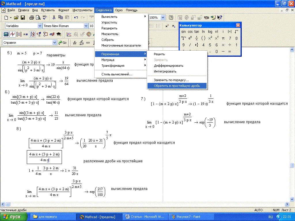 Разложения дроби на простейшие можно осуществить следующим образом: выделить переменную х и щёлкнуть по строке Обратить в простейшую дробь (Convert to Partial Fraction) в пункте Переменная (Variable) меню Символика (Symbolics).
