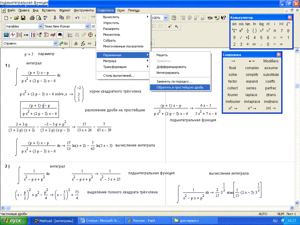 При нахождении неопределённых интегралов от некоторых видов рациональных функций методом неопределённых коэффициентов удобно вывести на экран корни квадратного трёхчлена. Решить квадратное уравнение можно, воспользовавшись специальной кнопкой <solve>, панели Символика (Symbolik). Представить подынтегральную функцию в виде суммы простейших дробей легко позволяет команда <Обратить в простейшую дробь> (<Convert to Partial Fraction>) в пункте Переменная (Variable) меню Символика (Symbolics). Пример такого шаблона можно увидеть на Рисунке 15. На этом же рисунке есть шаблон для решения и создания задач на нахождение неопределённого интеграла от рациональной функции методом выделения полного квадрата трёхчлена в знаменателе дроби.