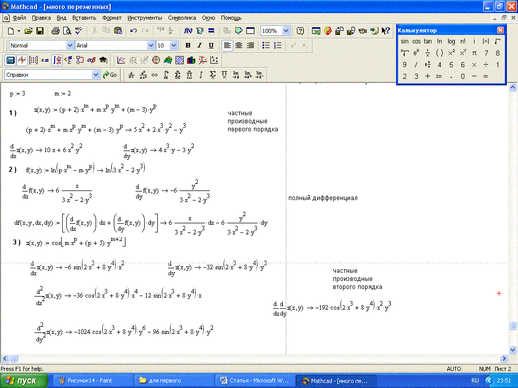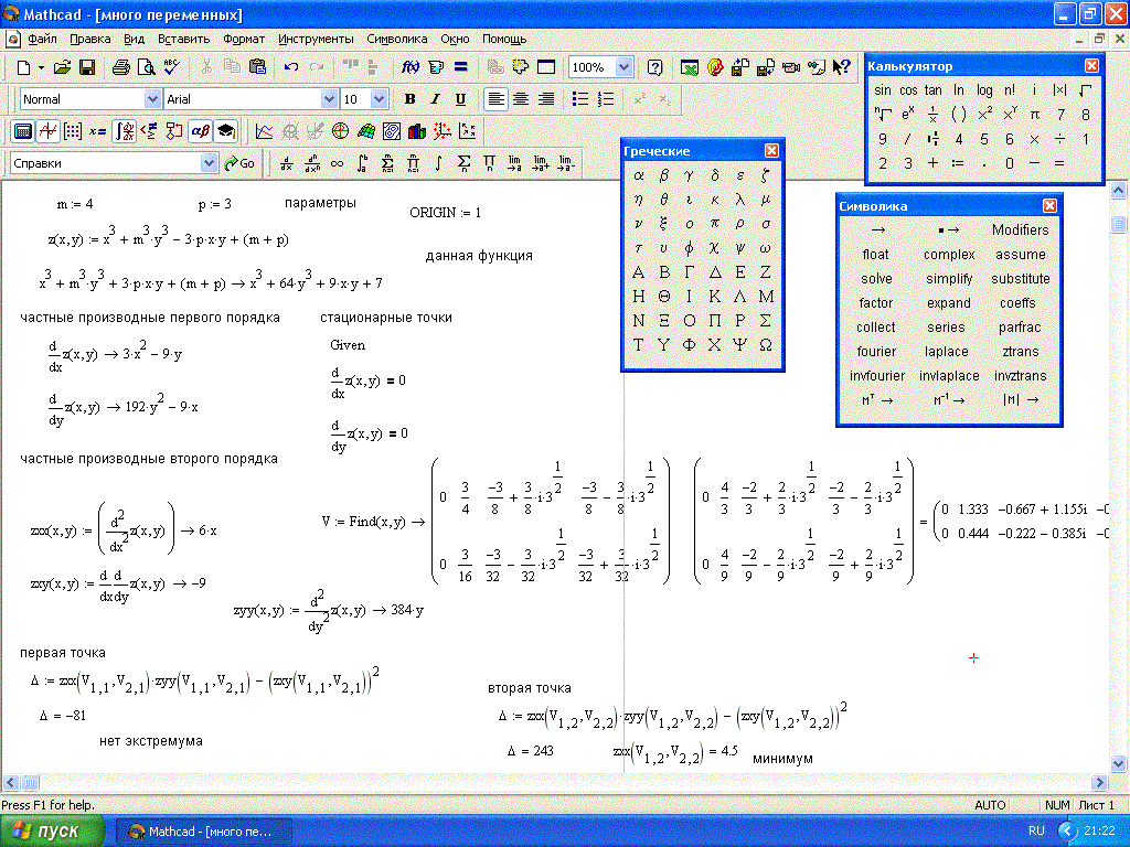 При нахождении точек экстремума функции двух переменных на экран необходимо вывести частные производные первого и второго порядков. При этом, для удобства дальнейших вычислений, частные производные второго порядка лучше обозначить функциями некоторых переменных х и у (в данном примере zxx(x,y), zxy(x,y), zyy(x,y)). Стационарные точки можно найти как решение системы уравнений (команды given и find), для удобства дальнейших вычислений, решения системы лучше обозначить как матрицу V. Все эти обозначения позволят в автоматическом режиме вычислять определитель (?), позволяющий узнать, есть в этой точке экстремум функции и является ли эта точка точкой максимума или минимума. Возможный шаблон такой задачи представлен на Рисунке 17. Если в данной функции изменить знак перед слагаемым 3рху с минуса на плюс, то получим новую серию задач, но найденные точки будут уже точками максимума.