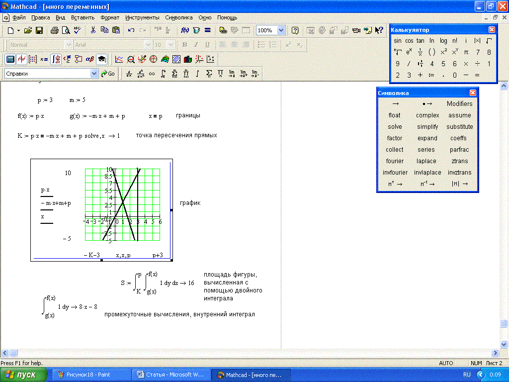 - координаты точек пересечения графиков (это осуществляется специальной кнопкой <solve> панели Символика (Symbolik), при этом, так как правая часть уравнении не равна нулю, то "равно" ставится жирное с помощью комбинаций клавиш <Ctrl>+<=> или специальной кнопкой панели Булевые (Boolean));