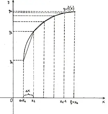 Если суммировать площади прямоугольников, которые показывают площадь криволинейной трапеции с недостатком [Рисунок1], то получим формулу: