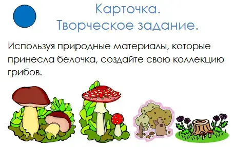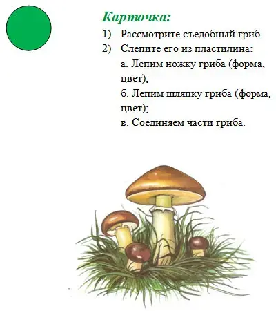 а) Скоро зима, все лесные жители спешат собрать запасы на зиму. Помогите это сделать белочке. Слепите для неё грибы. Но в лесу, кроме белочки, есть и другие жители, некоторые из которых питаются ядовитыми грибами. Кто это? (лось). Поэтому мы будем лепить грибы не только для белочки, но и для других лесных жителей. Из этого следует, что нам нужно слепить как съедобные, так и ядовитые грибы. Работу вы будете выполнять в парах, самостоятельно, по карточкам с цветовыми сигналами: