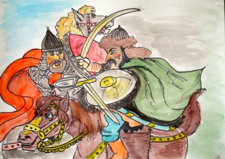 4-й экскурсовод: Среди других народов наши предки славились силой, выносливостью и смелостью. Их слава была столь велика, что прославленных предков наших, воинов - богатырей, часто вовлекали в войны, как союзников. Славно сражались они в пешем строю и копьем, одетые в простые рубахи, а то и полуголые. <Приложение 10>