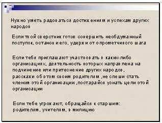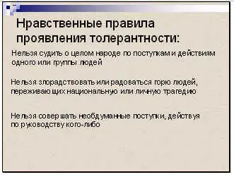 К сожалению, нетерпимость, культурный эгоизм все сильнее проникает в нашу жизнь. Страна, в которой представители всех национальностей, населяющих ее, заплатили так много за свою свободу в годы войны, слышит часто от некоторых "борцов за чистоту национальной культуры" призывы уничтожить тех, кто имеет иной цвет кожи, разрез глаз, акцент, религию. Сегодня мы собрались с вами для того, чтобы обсудить данную проблему и сделать собственные выводы по данному вопросу. Это слово дежурит в речах политиков, мелькает в быту и на разные лады толкуется в научной литературе. Упрек в отсутствии толерантности может быть брошен с экрана националистам и на кухне зятю, переключившему тещин сериал на новостную программу. |