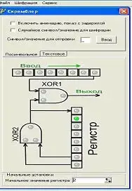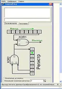 "Скремблер" позволяет послать сообщение, перед этим зашифровав его. Окно "скремблер" позволяет зашифровать сообщение методом шифрования скремблирования для этого вся информация наша "разбита" на биты, затем она шифруется регистром, который на самом деле является еще и псевдослучайным генератором. Скремблер (источник) и Дескремблер (получатель) запускаем с двух программных проектов, т.к. две программы на одном программном продукте, с одинаковыми портами не будут работать как скремблер и дескремблер. Со скремблера будет идти отправка данных, но на дескремблере не будет отражение получения данных.