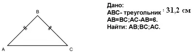В треугольнике АВС с периметром 31,2 см. АВ=ВС, АС - АВ = 6 см. найдите АВ, ВС и АС.