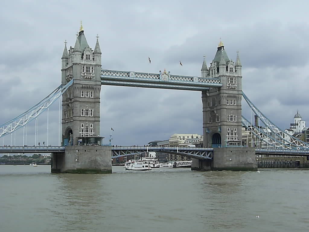 - А мы продолжаем наше путешествие. Рядом с Тауэром протекает река Темза. А через нее перекинут Тауэрский мост.