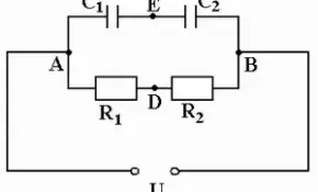 1. КОНДЕНСАТОРЫ В ЭЛЕКТРИЧЕСКОЙ ЦЕПИ. Рассчитайте разность потенциалов между точками Д и Е в электрической схеме, показанной на рисунке. Внутренним сопротивлением источника тока пренебречь. Если С1=4С, С2=С и R1=R, R2=3R.