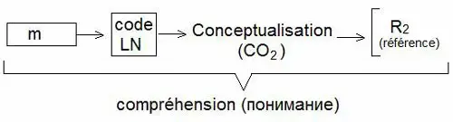 Речевой замысел говорящего предполагает ответную реакцию воспринимающего речь, которая будет адекватной, только если достигнуто понимание. Тот, кому адресуется сообщение, сначала опознает сигнал (слуховой или зрительный), идентифицирует его, сличая с хранящимся в его сознании языковым кодом; его задача - уловить мысль, закодированную в этом сообщении, опознать ее на понятийном уровне (structure d'entendement) и соотнести полученную информацию с экстралингвистической ситуацией, представленной в сообщении (référence). Как указывает Потье ,общим для говорящего и воспринимающего становится не сообщение как таковое, а мысль, зафиксированная в этом сообщении и адекватно воспринятая адресатом речи. Общая схема выглядит так:
