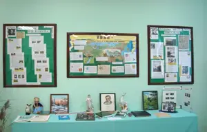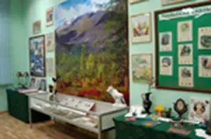 Передвигаясь дальше, мы видим сундук с минералами. В середине музея стоит на постаменте бюст П.П. Бажова, справа от него детские работы и стенды иллюстрации к сказам. Далее - витрина, в которой собрана коллекция значков и книги, написанные уральским чудословом. Затем видим стенд посвященный работе детей, их вкладу в создание музея: поделки, рисунки. Уже оформлен рудник и пещера, где добывались самоцветы.