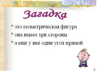 Это геометрическая фигура. Она имеет 3 стороны. А ещё у неё 1 угол прямой (прямоугольный треугольник). (Слайд 3)