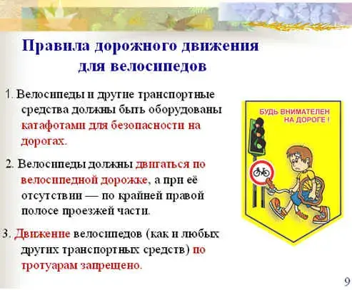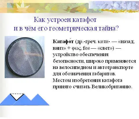 Доказательство проводят ученики в парах с помощью учителя математики. (Слайд 9) Итак, благодаря свойствам прямоугольного треугольника, мы раскрыли тайну нашего необычного предмета, а зачем он нужен - "возвращает назад" свет автомобильных фар, что даёт возможность водителю видеть ночью идущий впереди велосипед. А можно ли ездить детям ночью на велосипеде? (вспомним ПДД).